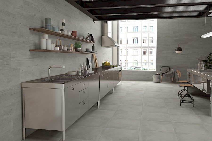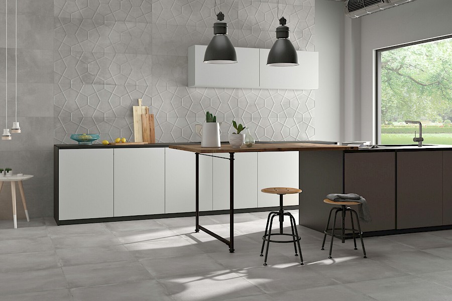 Skandinaviseen värimaailmaan soveltuva, pehmeäsävyinen betonijäljitelmälaatta.