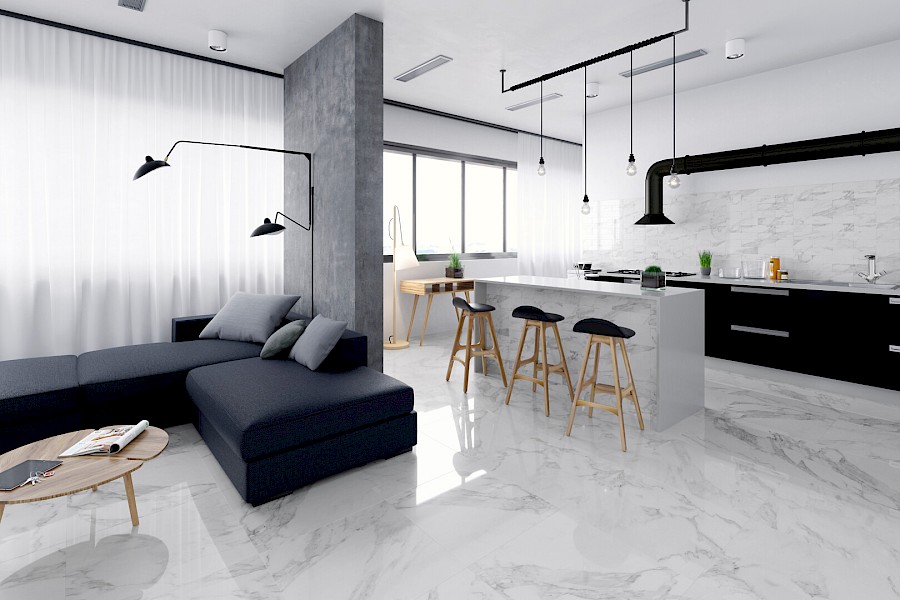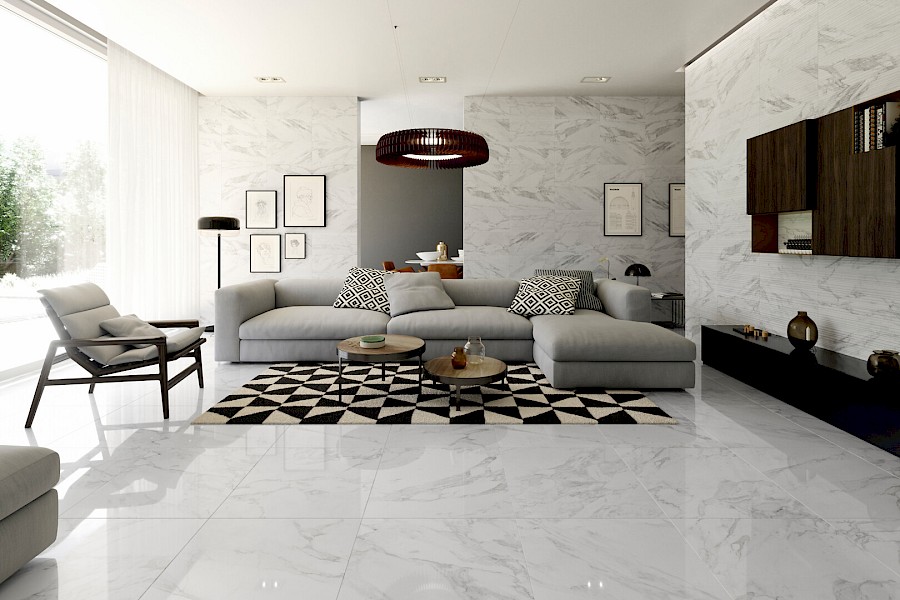 Carrara White Shine Floor on näyttävä, kiiltäväpintainen, rektifioitu lattialaatta. Kuviot laatoissa vaihtelevat, sillä sarjassa on 13 erilaista laattaa