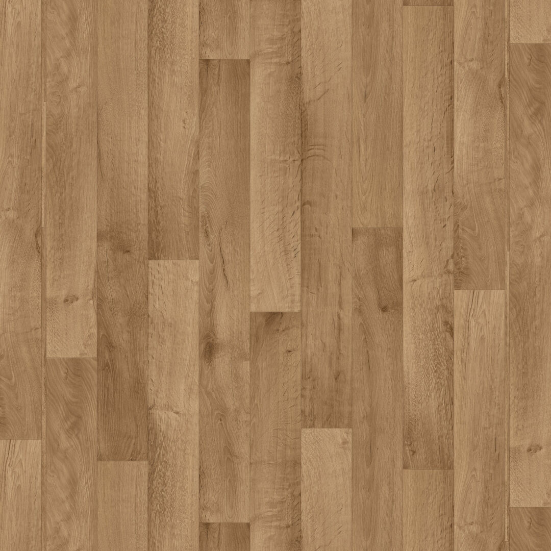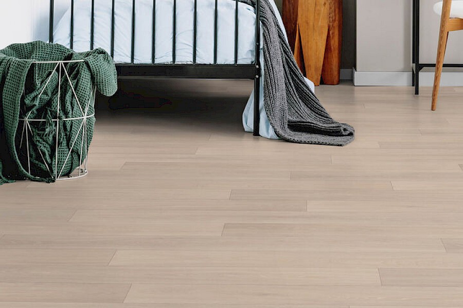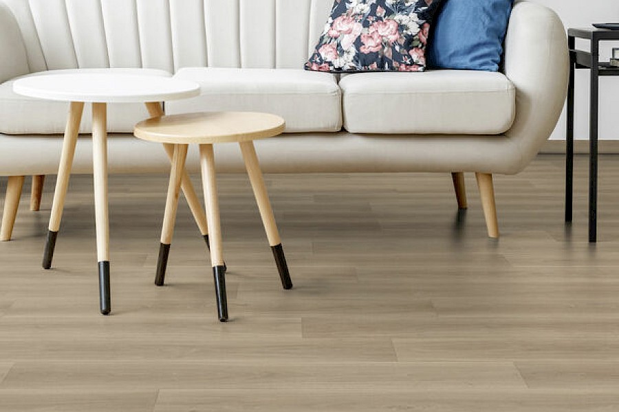 Kulutusta kestävä huopapohjainen vinyylilattia, joka vaimentaa askelääntä ja on miellyttävä jalan alla.