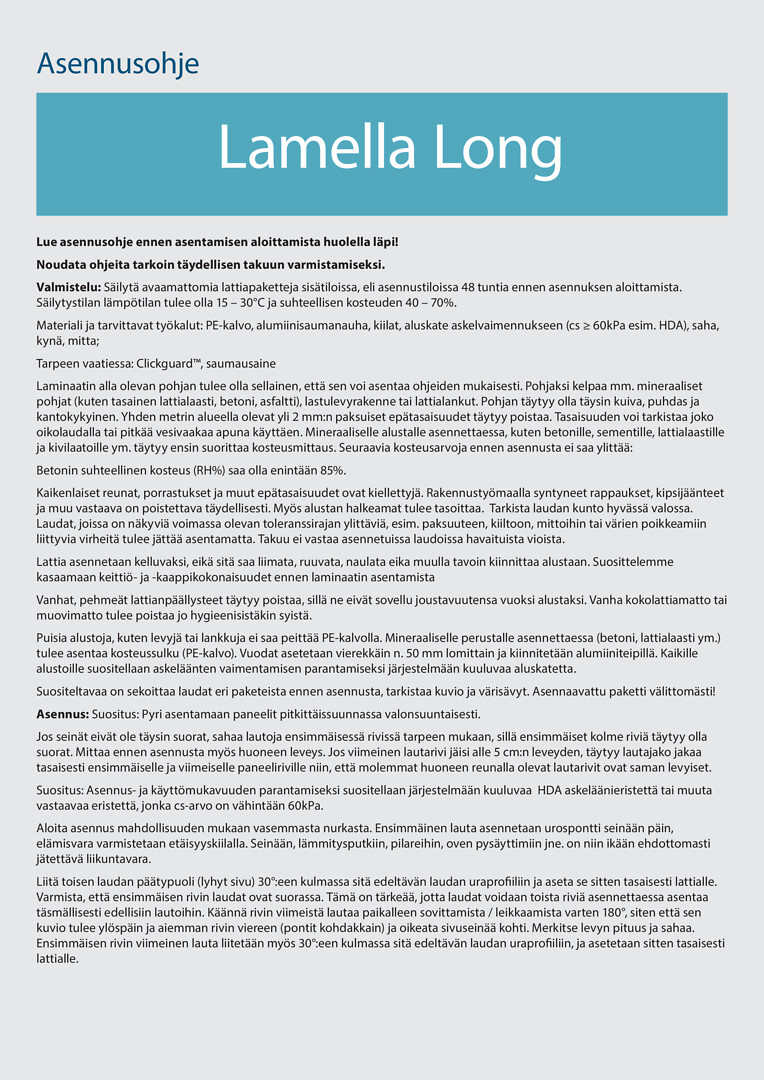 Sarjassa on neljä upeaa lankkukuosia, kaikilla sivuilla reunaviisteet jotka antavat lattiallesi aidon lankkulattian ulkonäön ja tunteen. Lamella Long käy teknisten ominaisuuksiensa puolesta myös julkisiin tiloihin, sillä sen käyttöluokka on AC4/32. Asennus on entistäkin helpompaa painettavan päätypontin ansiosta.